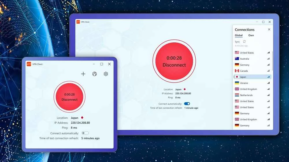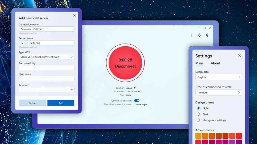 VPN Client สำหรับ Windows เป็นเครื่องมือที่สะดวกสำหรับจัดการกิจกรรมออนไลน์ของคุณ พร้อมกับการเข้ารหัสข้อมูลออนไลน์ ซ่อนที่อยู่ IP จริงของคุณ และช่วยให้คุณท่องเว็บได้อย่างสะดวกสบาย พร้อมเลือกเซิร์ฟเวอร์ที่ต้องการ คุณสามารถใช้งานได้ฟรี และสมัครสมาชิกหากต้องการฟีเจอร์เพิ่มเติม